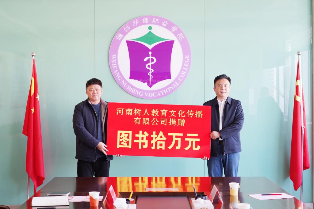 河南树人教育文化传播有限公司董事长张曙光、潍坊护理职业学院院长王文军出席捐赠仪式。王文军院长对企业的慷慨捐赠表示衷心感谢,他强调,这批图书将丰富学校图书信息中心馆藏,为学校教学科研工作注入新的活力。张曙光董事长介绍了企业发展概况,指出作为教育文化传播领域的骨干企业,此次捐赠是企业履行社会责任,助力医药卫生职业教育高质量发展的重要举措。