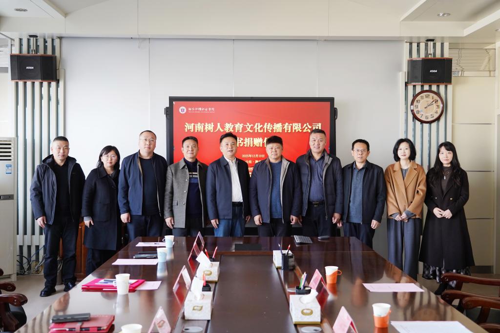 2025年12月10日下午,学校在5楼会议室举行图书捐赠仪式,河南树人教育文化传播有限公司向我校捐赠价值10万元的专业图书,以实际行动支持学校教育事业发展,助力师生学术研究与专业能力提升。